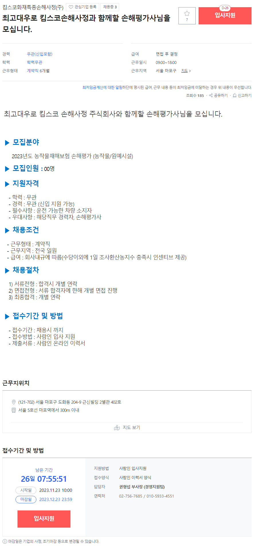 링크주소 : https://www.saramin.co.kr/zf_user/jobs/relay/view?isMypage=no&rec_idx=47038044&recommend_ids=eJxVj8ENQzEIQ6fpnRCwzbmDdP8tylelkB6fbORHoBbc66O1XnwHaAnZwdpJ5EG5LL3RftgxpqwocMplXuSUAWUe7BTS7Ca2RqMPd5yUZmr%2BQz8atJWel0blsj1DCi67kEWfcn8LXCkCcWmI8VjZF3zzQH0%3D&view_type=search&searchword=%EC%86%90%ED%95%B4%ED%8F%89%EA%B0%80%EC%82%AC&searchType=search&gz=1&t_ref_content=generic&t_ref=search&paid_fl=n&search_uuid=8617b00a-db27-44b9-af86-139f142c4ba8&immediately_apply_layer_open=n#seq=0