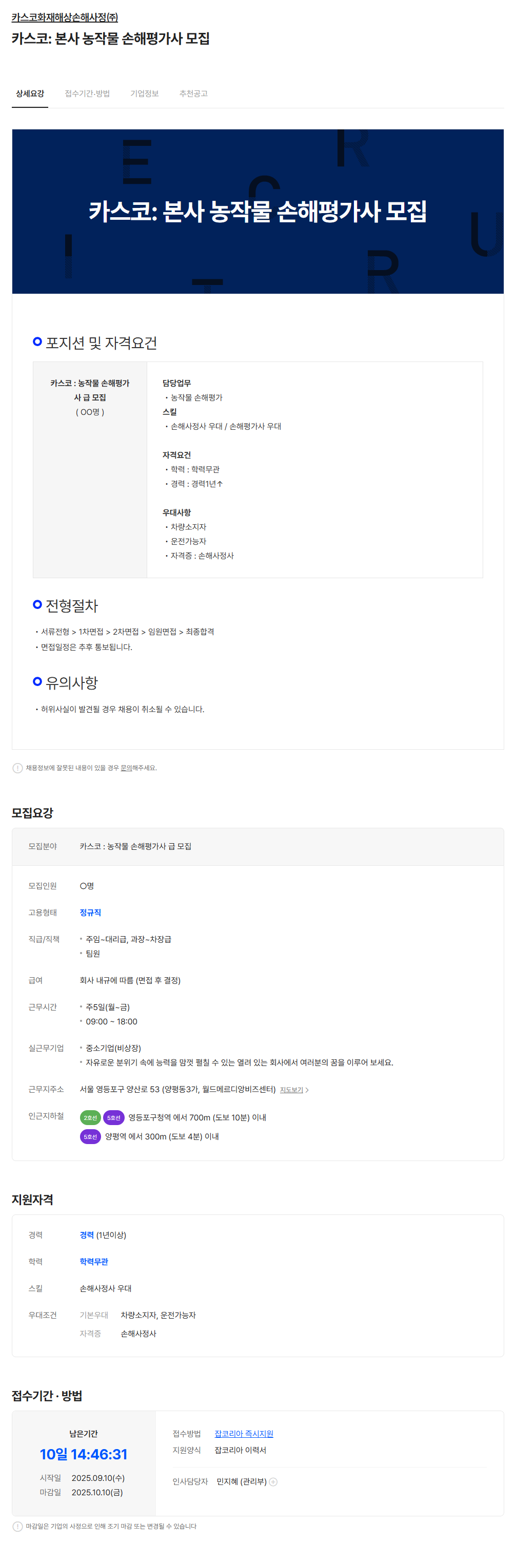 - 잡코리아 채용공고 - 링크주소 : https://www.jobkorea.co.kr/Recruit/GI_Read/47673470?Oem_Code=C1&logpath=1&stext=%EC%86%90%ED%95%B4%ED%8F%89%EA%B0%80%EC%82%AC&listno=2&sc=630&rt=B