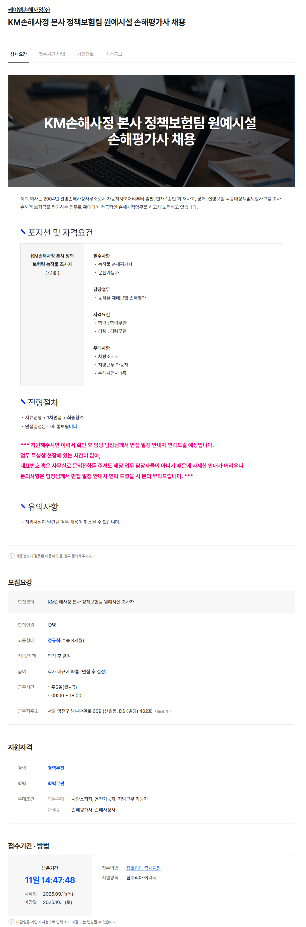 - 잡코리아 채용공고 -링크주소 : https://www.jobkorea.co.kr/Recruit/GI_Read/47680668?Oem_Code=C1&logpath=1&stext=%EC%86%90%ED%95%B4%ED%8F%89%EA%B0%80%EC%82%AC&listno=1&sc=630&rt=B