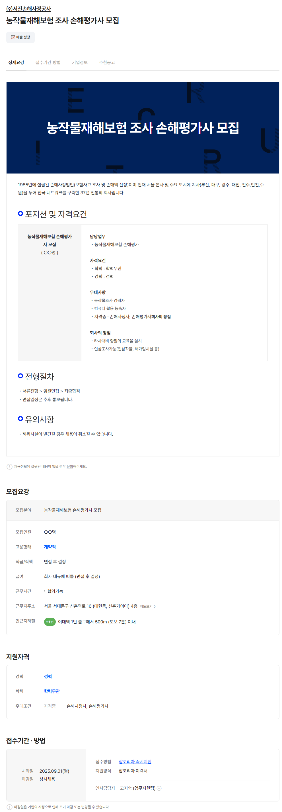 잡코리아 채용공고링크주소 : https://www.jobkorea.co.kr/Recruit/GI_Read/47612014?Oem_Code=C1&logpath=1&stext=%EC%86%90%ED%95%B4%ED%8F%89%EA%B0%80%EC%82%AC&listno=2&sc=630