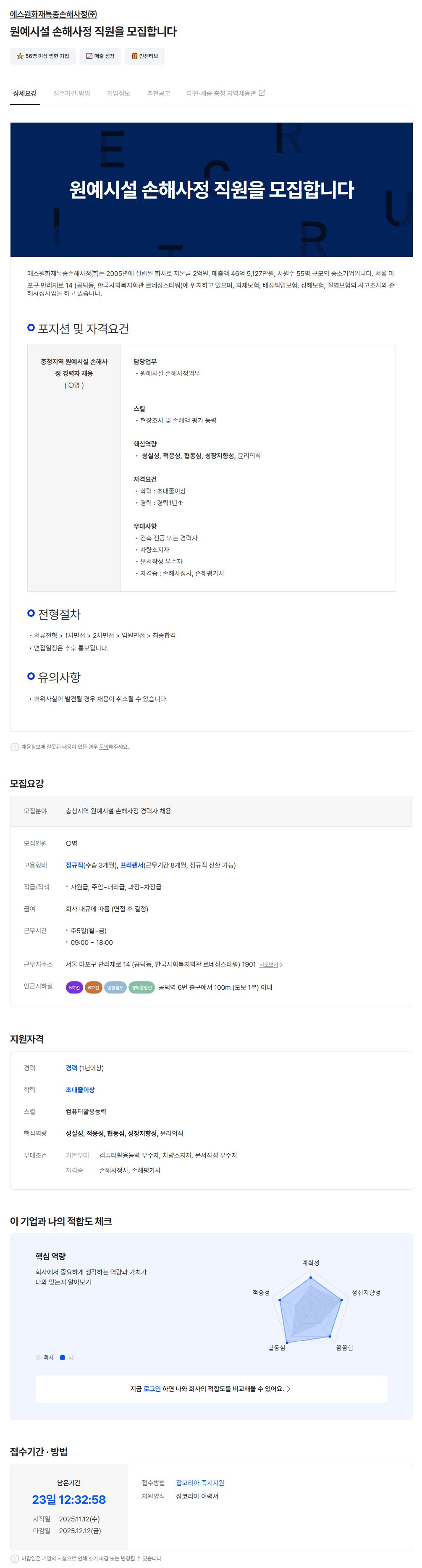 - 잡코리아 채용공고 - 링크주소 : https://www.jobkorea.co.kr/Recruit/GI_Read/48034290?Oem_Code=C1&logpath=1&stext=%EC%86%90%ED%95%B4%ED%8F%89%EA%B0%80%EC%82%AC&listno=6&sc=630