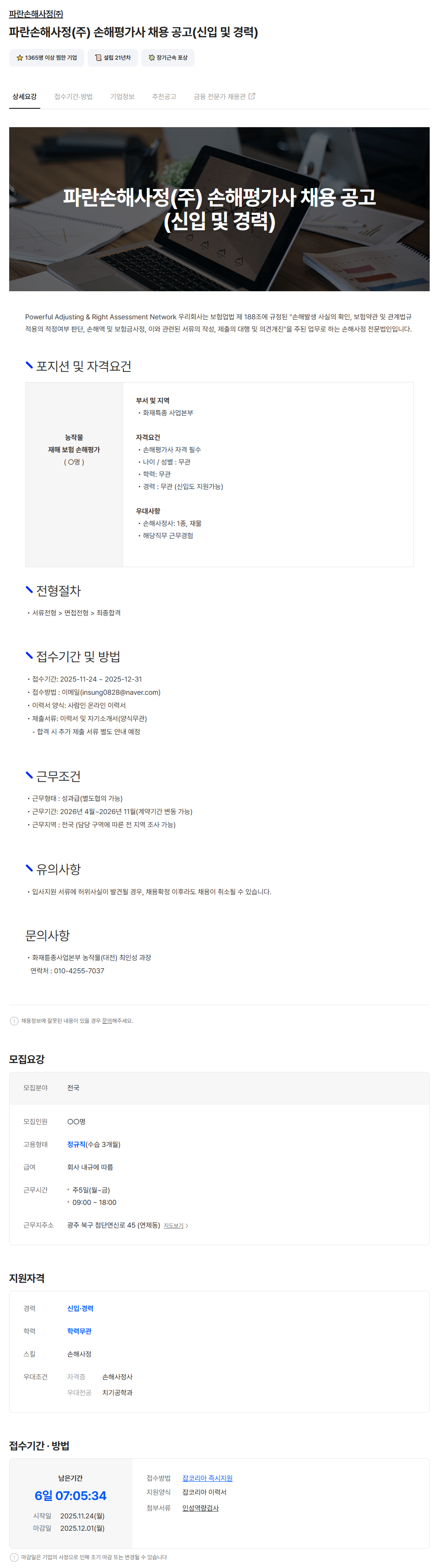 - 잡코리아 채용공고 - 링크주소 : https://www.jobkorea.co.kr/Recruit/GI_Read/48098568?Oem_Code=C1&logpath=1&stext=%EC%86%90%ED%95%B4%ED%8F%89%EA%B0%80%EC%82%AC&listno=15&sc=630