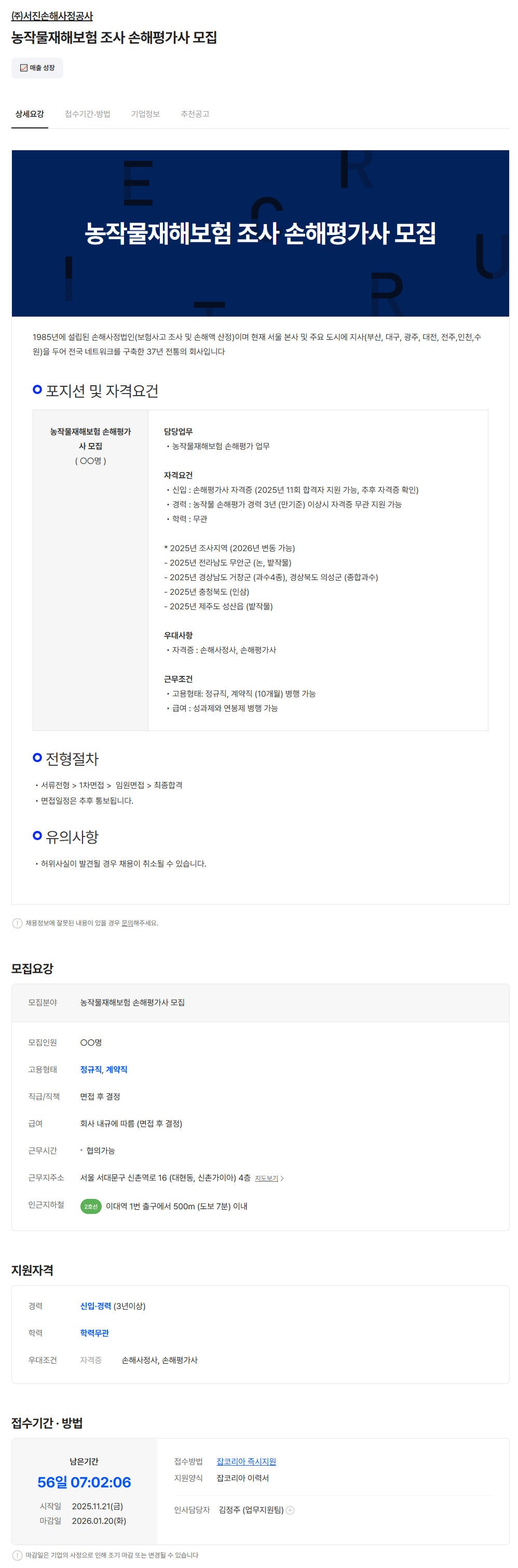 - 잡코리아 채용공고 - 링크주소 : https://www.jobkorea.co.kr/Recruit/GI_Read/48088947?Oem_Code=C1&logpath=1&stext=%EC%86%90%ED%95%B4%ED%8F%89%EA%B0%80%EC%82%AC&listno=1&sc=630