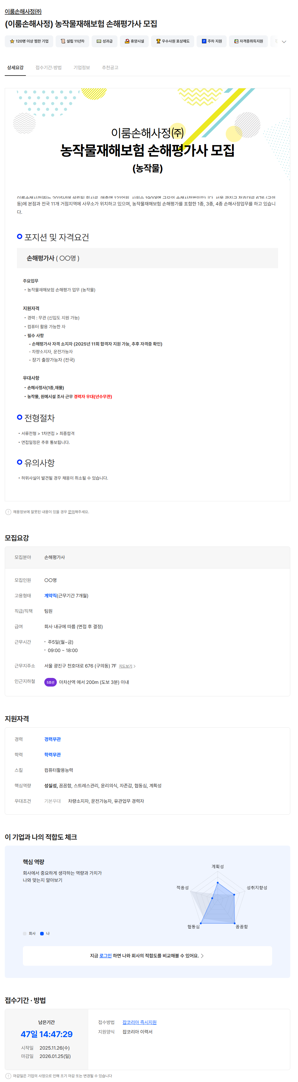 - 잡코리아 채용공고 - 링크주소 : https://www.jobkorea.co.kr/Recruit/GI_Read/48119793?Oem_Code=C1&logpath=1&stext=%EC%86%90%ED%95%B4%ED%8F%89%EA%B0%80%EC%82%AC&listno=1&sc=630