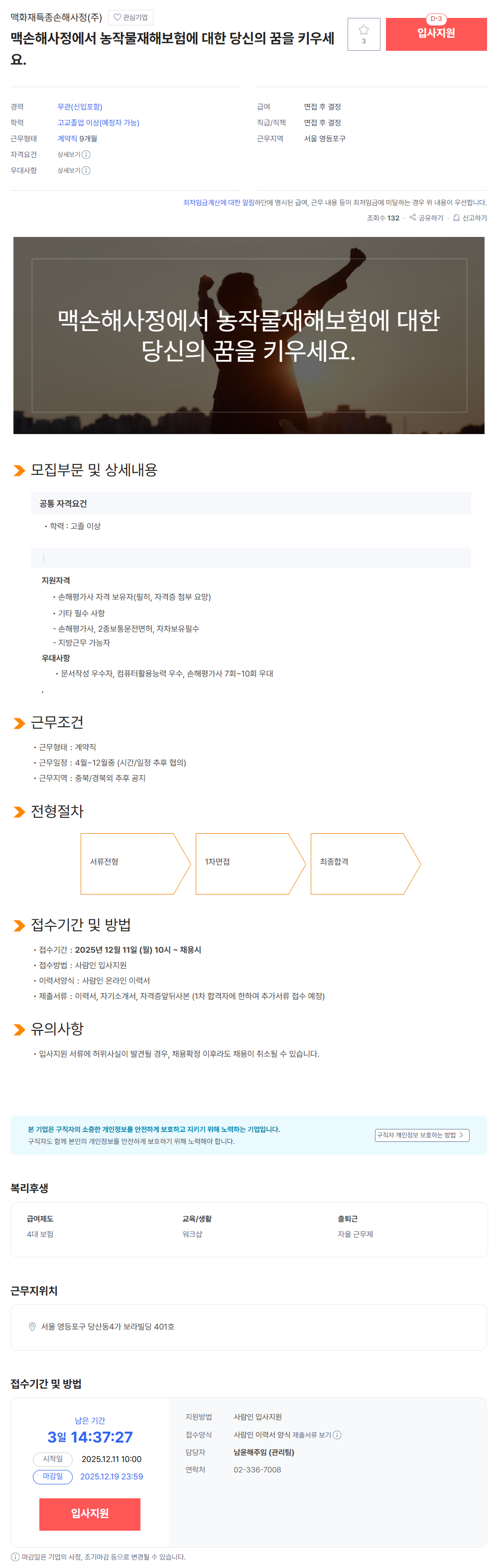 사람인 채용공고 링크주소 : https://www.saramin.co.kr/zf_user/jobs/relay/view?isMypage=no&rec_idx=52539175&recommend_ids=eJxdkMkNxFAIQ6uZu1nMck4h6b%2BLyUgj%2BMrxYTAGKrUUdpfgkxeVZqwedDJ5oGczH5QX3v4vwOJoD2n4oJUzc1AErosKImq81UXCdhUrnWsVpaKjEl0mR0zLjlHFrWJVowKrukRBj8wdwp1NoPx8wHPhD7%2BrdkOV&view_type=search&searchword=%EC%86%90%ED%95%B4%ED%8F%89%EA%B0%80%EC%82%AC&searchType=search&gz=1&t_ref_content=generic&t_ref=search&relayNonce=5cab6c76170f1c2307db&paid_fl=n&search_uuid=f0df62cf-7a2f-48a8-9fc1-16ec921cd822&immediately_apply_layer_open=n#seq=0
