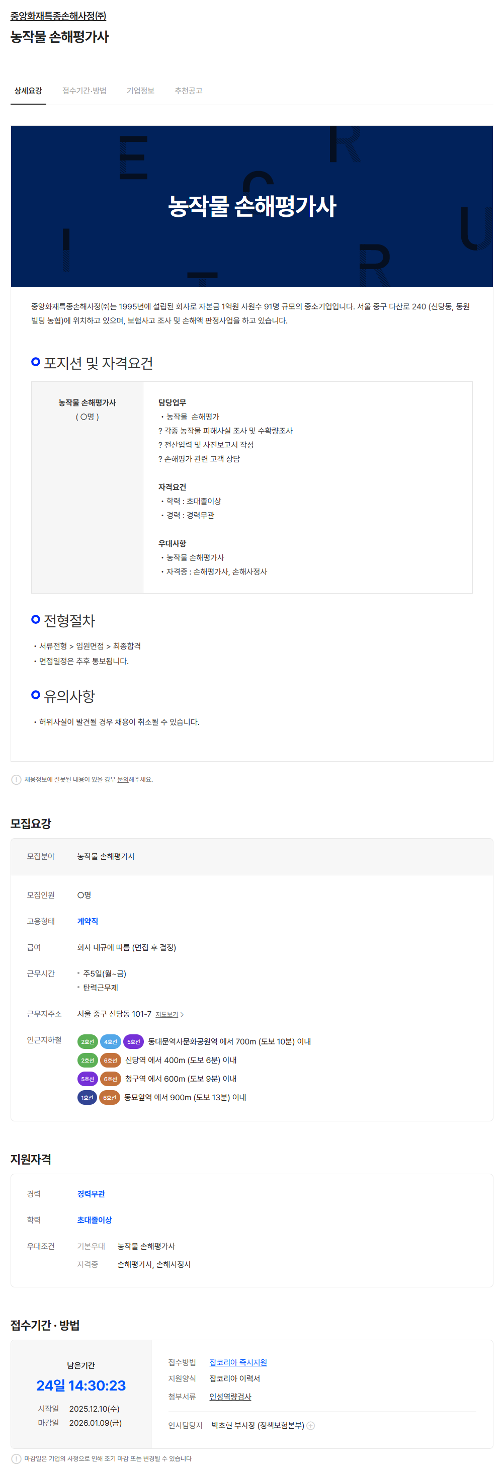 잡코리아 채용공고링크주소 : https://www.jobkorea.co.kr/Recruit/GI_Read/48208562?Oem_Code=C1&logpath=1&stext=%EC%86%90%ED%95%B4%ED%8F%89%EA%B0%80%EC%82%AC&listno=1&sc=630