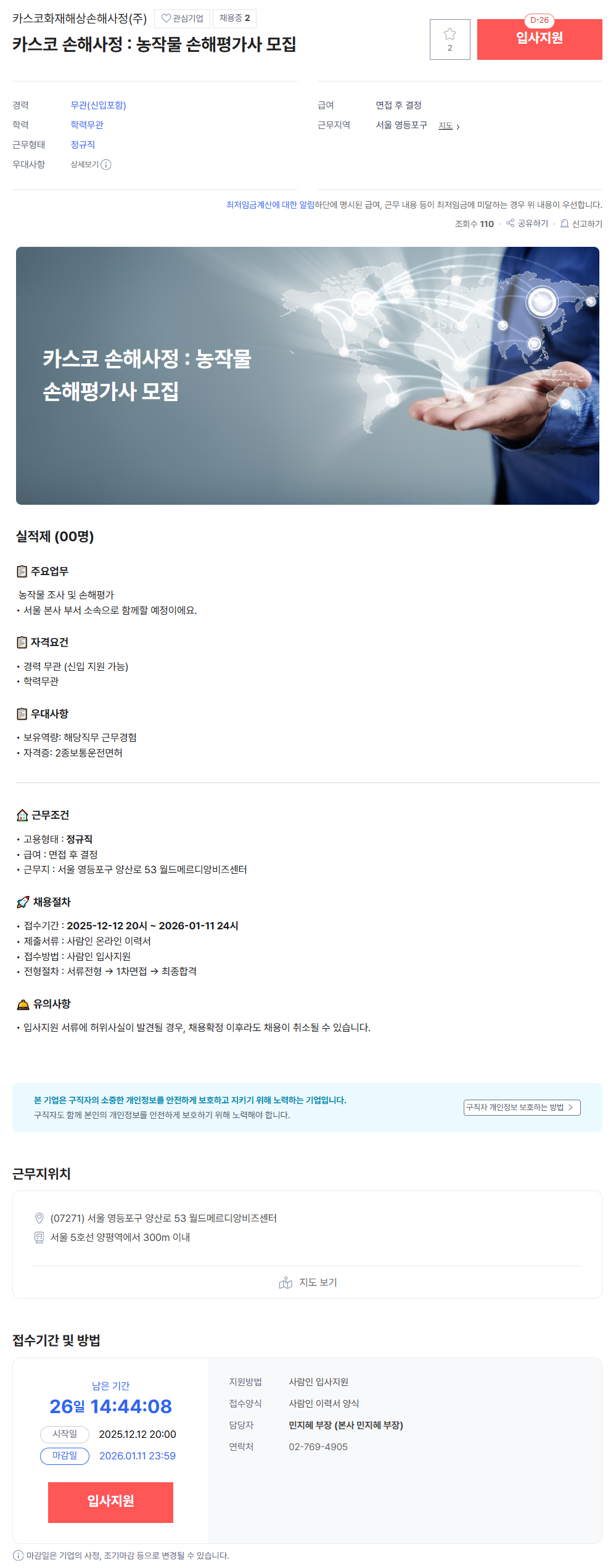 [중앙화재특종손해사정(주)] 농작물 손해평가사 - 26년 1월 9일 까지