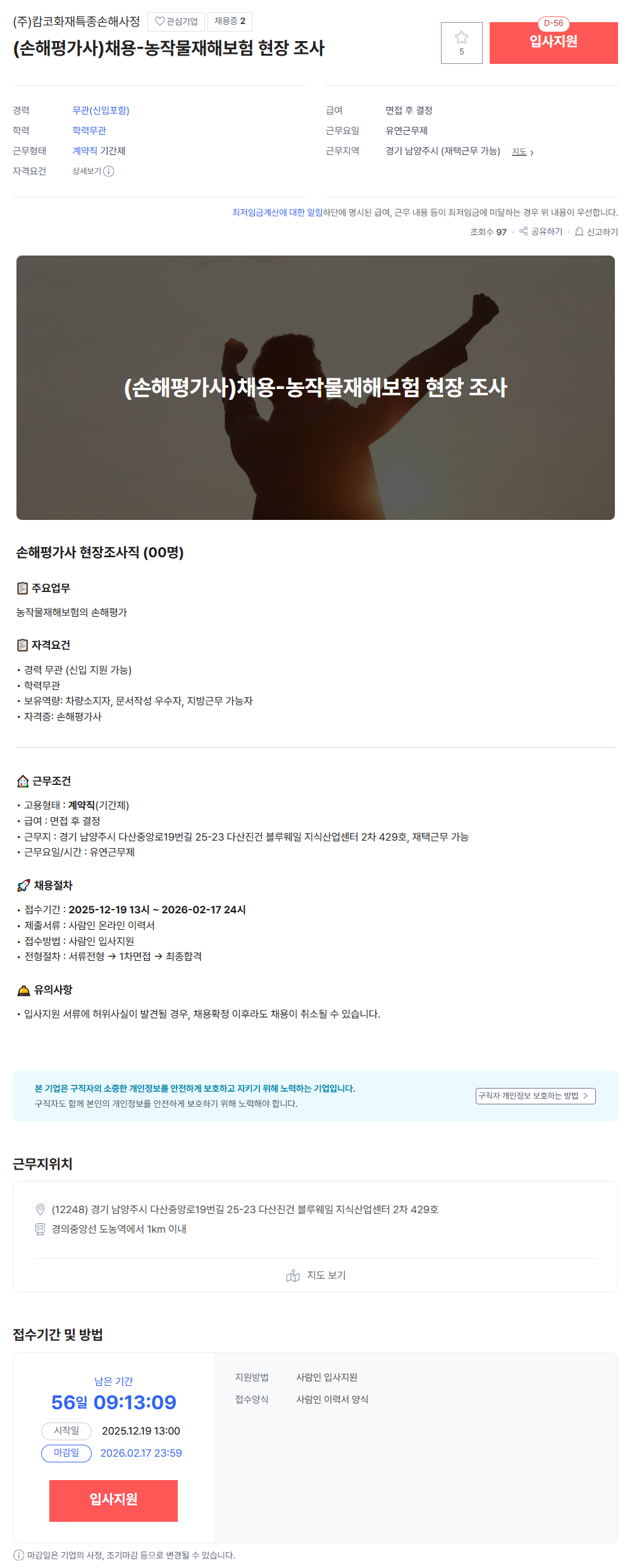 - 사람인 채용공고 -링크주소 : https://www.saramin.co.kr/zf_user/jobs/relay/view?isMypage=no&rec_idx=52613232&recommend_ids=eJxNzbERA0EIQ9FqnANCAuIrxP13Yc8Fu4Rv9AcYjA7Dt90%2F9TAIsOdPe4lWUoud5id2WECHmTWsS%2FlYrtWgOUQn68ZhNPWhwPHLSHdhn%2BrRiosZa4X4PvoBxTMvxA%3D%3D&view_type=search&searchword=%EC%86%90%ED%95%B4%ED%8F%89%EA%B0%80%EC%82%AC&searchType=search&gz=1&t_ref_content=generic&t_ref=search&relayNonce=478abf332647c7ff7e6f&paid_fl=n&search_uuid=5ba589fe-329c-418c-b014-fcc81c34e1e7&immediately_apply_layer_open=n#seq=0