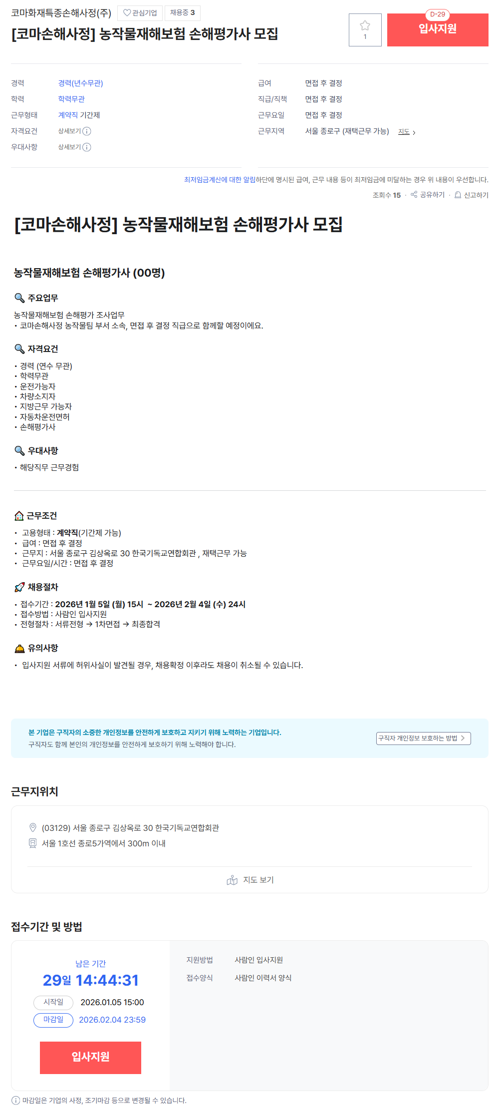 [대양화재특종손해사정(주)] 원주지점 농작물재해보험 조사자 정규직 채용 공고 - 26...