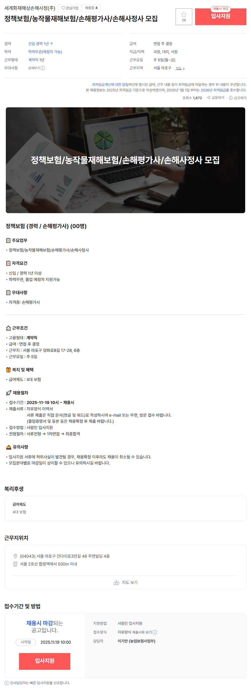 - 사람인 채용공고 -링크주소 : https://www.saramin.co.kr/zf_user/jobs/relay/view?isMypage=no&rec_idx=52347067&recommend_ids=eJxNzrkRA0AIA8BqnIMe4GIX4v678BNwDndGSBiSwHlNxqOfRjEj%2BsP80UMBS84ocolw1CzbR8ytanRKS%2Bscnlt1RvUXTiC5VJ1Kb7imWnfIGATv7tC8PzdMf2%2FjDbzcL74%3D&view_type=search&searchword=%EC%86%90%ED%95%B4%ED%8F%89%EA%B0%80%EC%82%AC&searchType=search&gz=1&t_ref_content=generic&t_ref=search&relayNonce=23e84323015ca6cb4617&paid_fl=n&search_uuid=c57e510b-7618-46ee-a071-0acc880aaf00&immediately_apply_layer_open=n#seq=0