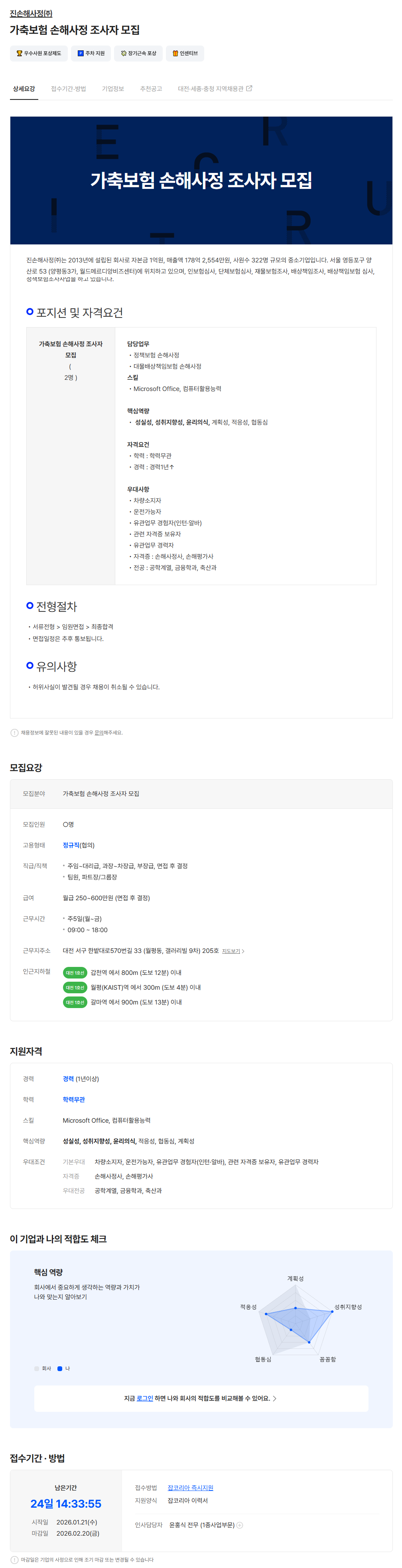 - 잡코리아 채용공고 -- 링크주소 : https://www.jobkorea.co.kr/Recruit/GI_Read/48458736?Oem_Code=C1&logpath=1&stext=%EC%86%90%ED%95%B4%ED%8F%89%EA%B0%80%EC%82%AC&listno=19&sc=630