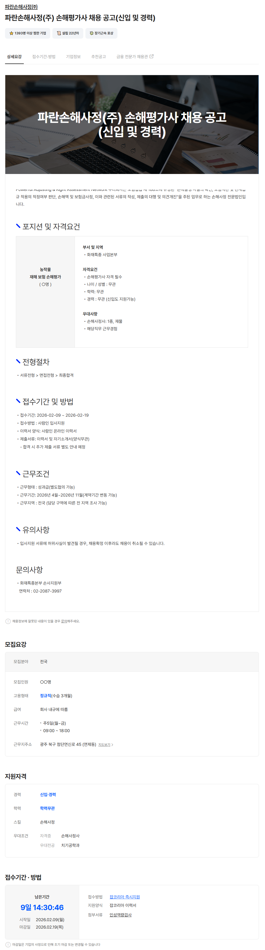 | [파란손해사정(주)] 파란손해사정(주)손해평가사 채용공고 (신입 및 경력) - 26년 2월 19일까지 | 학습관리자 / 2026.02.10 | |