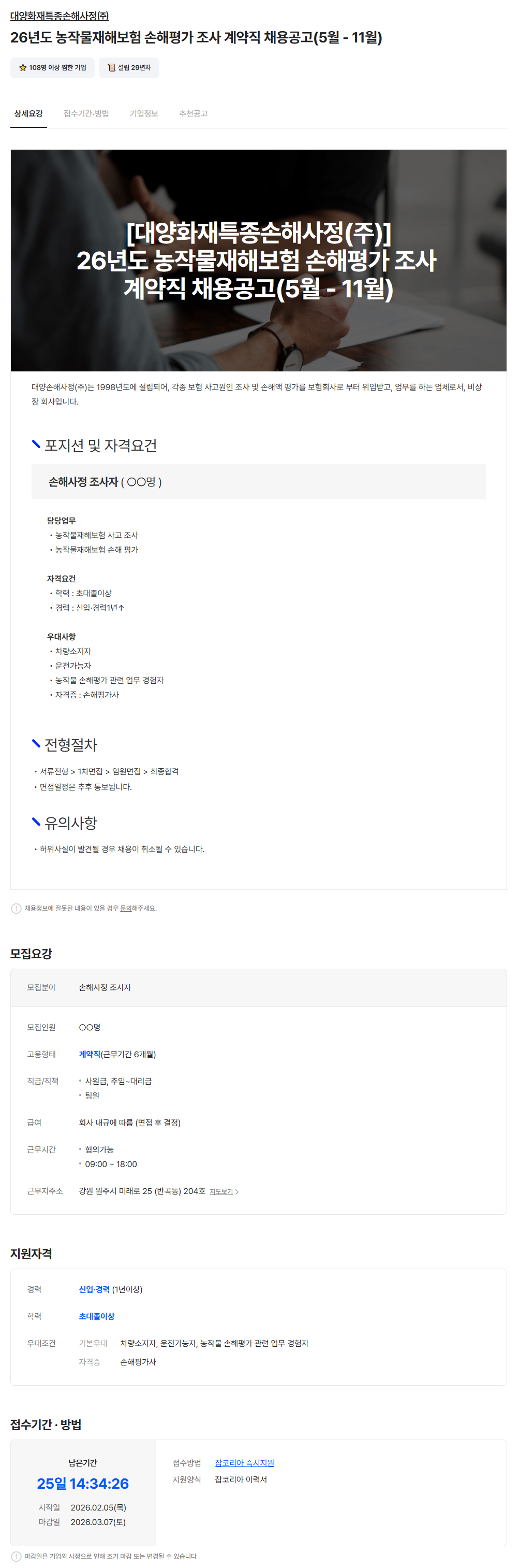 | [대양화재특종손해사정(주)] 26년도 농작물재해보험 손해평가 조사 계약직 채용공고(5월-11월) - 26년 3월 7일까지 | 학습관리자 / 2026.02.10 | |