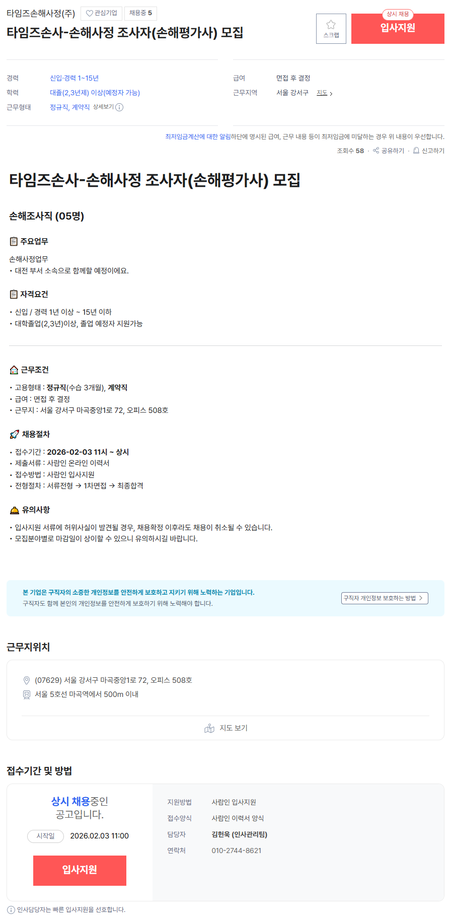 [타임즈손해사정(주)] 타임즈손사-손해사정 조사자(손해평가사) 모집 - 상시채용 학습관리자 / 2026.02.10