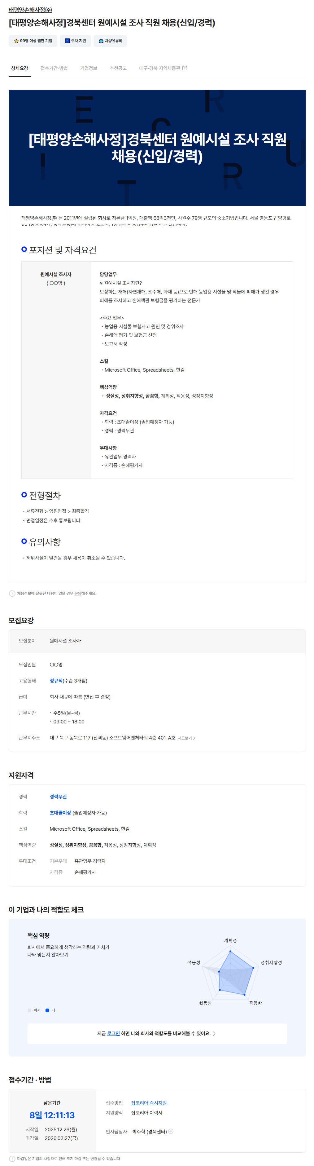 | [태평양손해사정(주)] 경북센터 원예시설 조사 직원 채용(신입/경력) - 26년 2월 27일까지 | 학습관리자 / 2026.02.19 | |