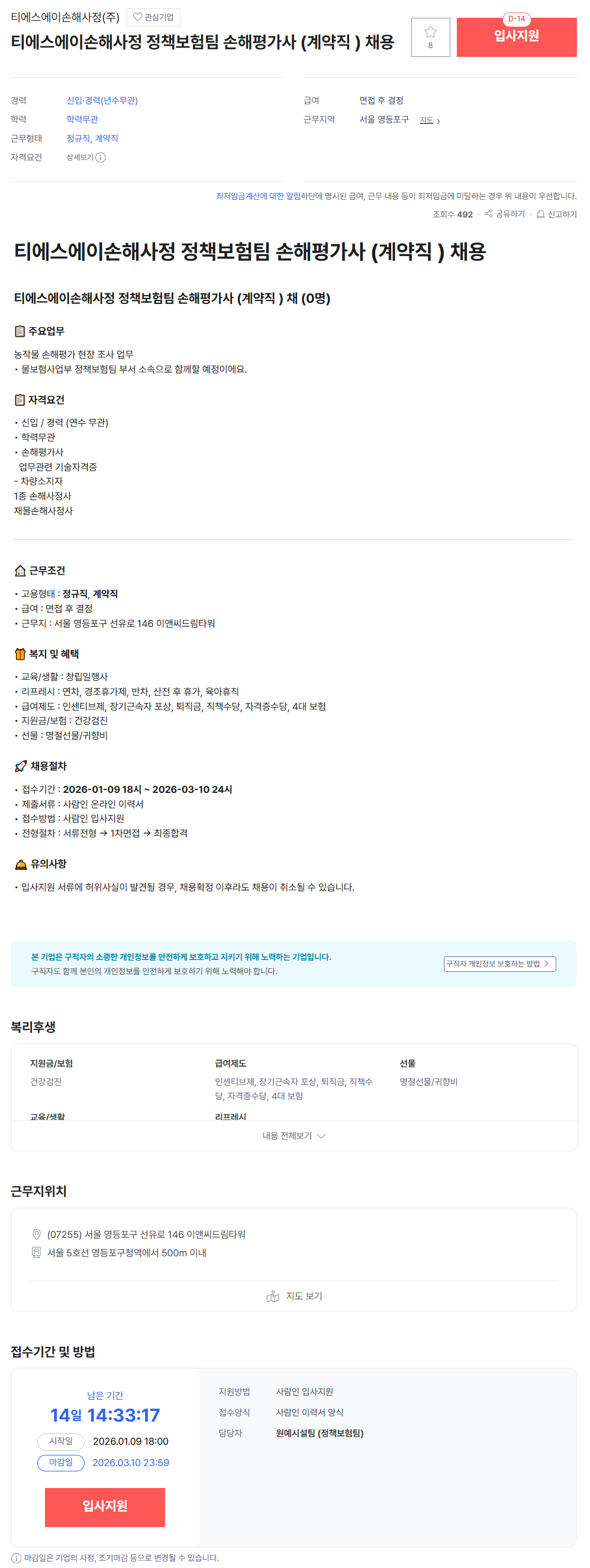 | [티에스에이손해사정(주)] 티에스에이손해사정 정책보험팀 손해평가사 (계약직) 채용 - 26년 3월 10일까지 | 학습관리자 / 2026.02.24 | |