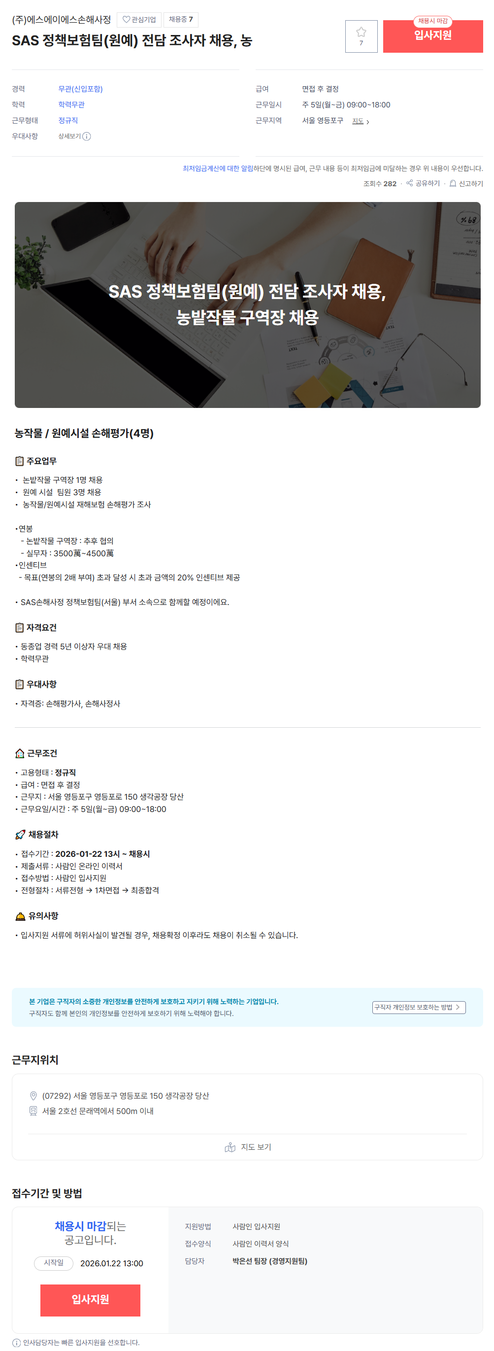 - 사람인 채용공고 - 링크주소 : https://www.saramin.co.kr/zf_user/jobs/relay/view?view_type=search&rec_idx=52896232&location=ts&searchword=%EC%86%90%ED%95%B4%ED%8F%89%EA%B0%80%EC%82%AC&searchType=search&paid_fl=n&search_uuid=2fca3e1f-52c5-4093-9996-72ff58e6bd04&t_ref=search&t_ref_content=generic#seq=0