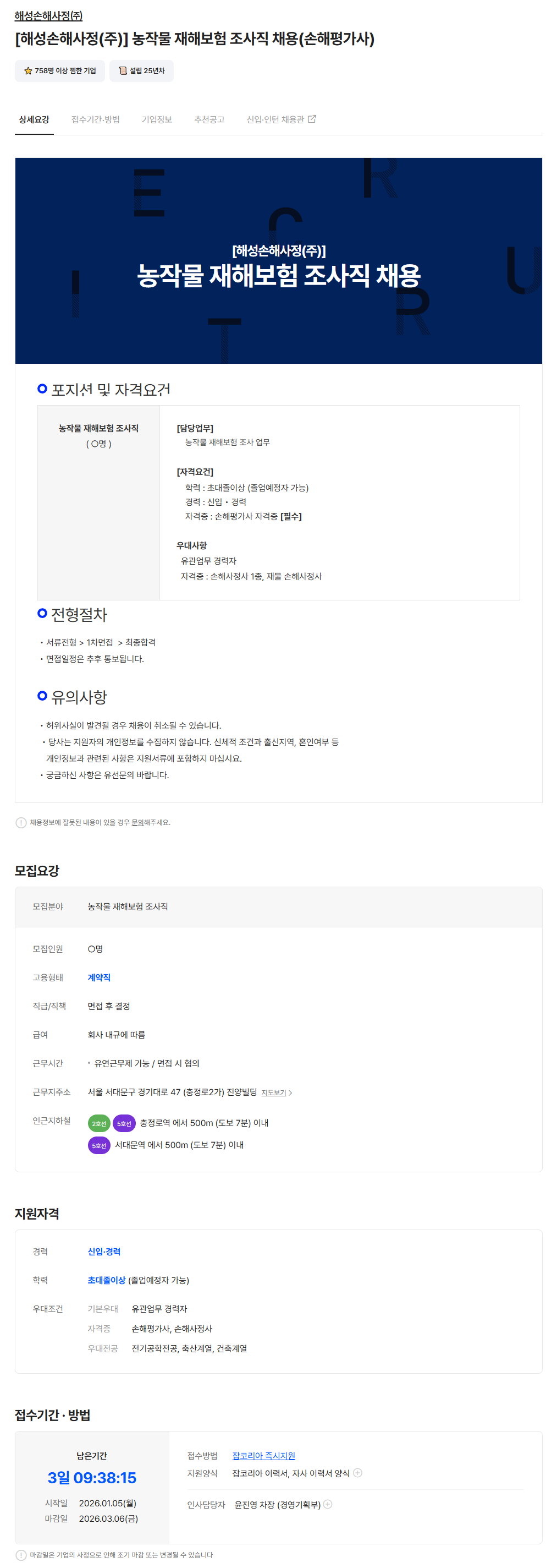 - 잡코리아 채용공고 - 링크주소 : https://www.jobkorea.co.kr/Recruit/GI_Read/48349818?Oem_Code=C1&logpath=1&stext=%EC%86%90%ED%95%B4%ED%8F%89%EA%B0%80%EC%82%AC&listno=3&sc=630