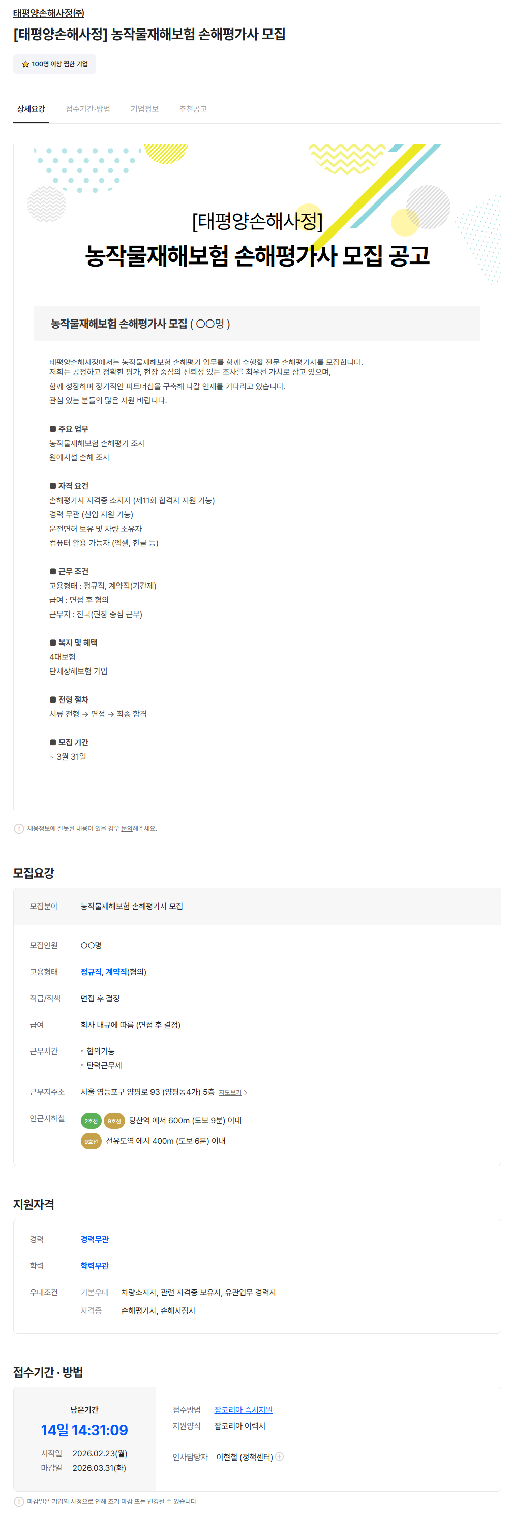 - 잡코리아 채용공고 -- 링크주소 : https://www.jobkorea.co.kr/Recruit/GI_Read/48640222?Oem_Code=C1&logpath=1&stext=%EC%86%90%ED%95%B4%ED%8F%89%EA%B0%80%EC%82%AC&listno=5&sc=630