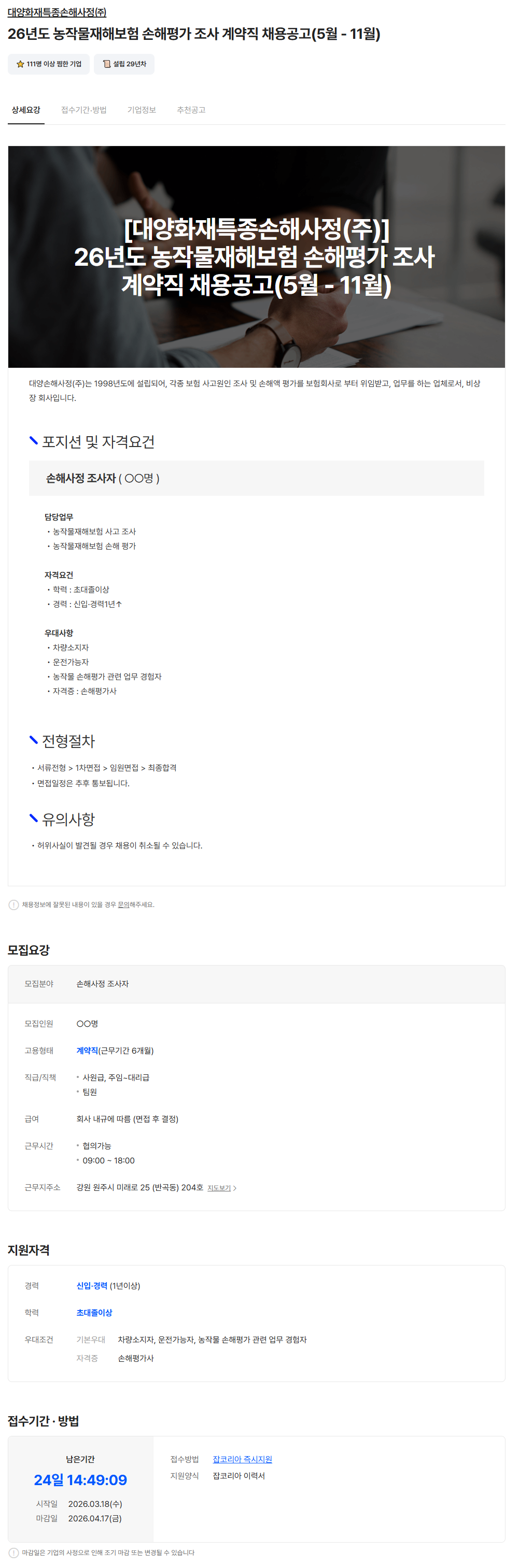 - 잡코리아 채용공고 - 링크주소 : https://www.jobkorea.co.kr/Recruit/GI_Read/48803710?Oem_Code=C1&logpath=1&stext=%EC%86%90%ED%95%B4%ED%8F%89%EA%B0%80%EC%82%AC&listno=9&sc=630