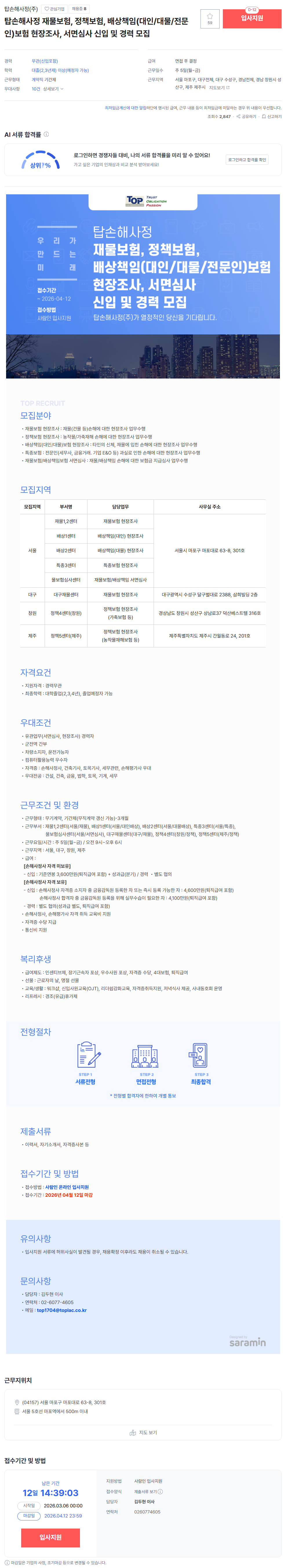 [프라임손해사정] 대구팀, 대전팀1종(재물, 배상, 정책) 조사자 채용 - 26년4월12일까...