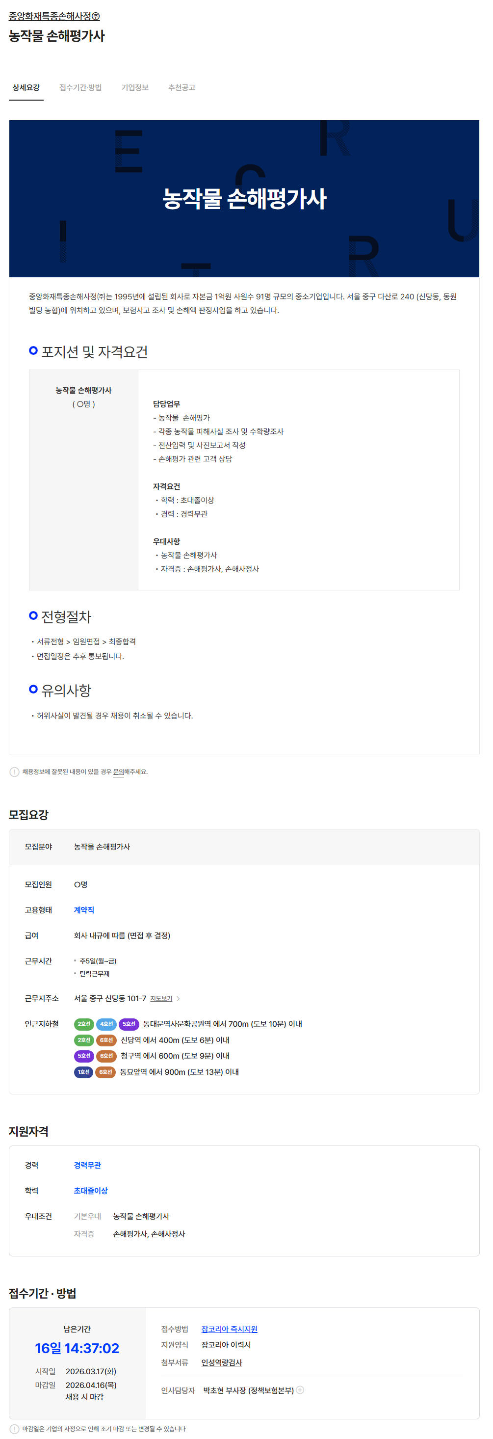 - 잡코리아 채용공고- 링크주소 : https://www.jobkorea.co.kr/Recruit/GI_Read/48795280?Oem_Code=C1&logpath=1&stext=%EC%86%90%ED%95%B4%ED%8F%89%EA%B0%80%EC%82%AC&listno=1&sc=630