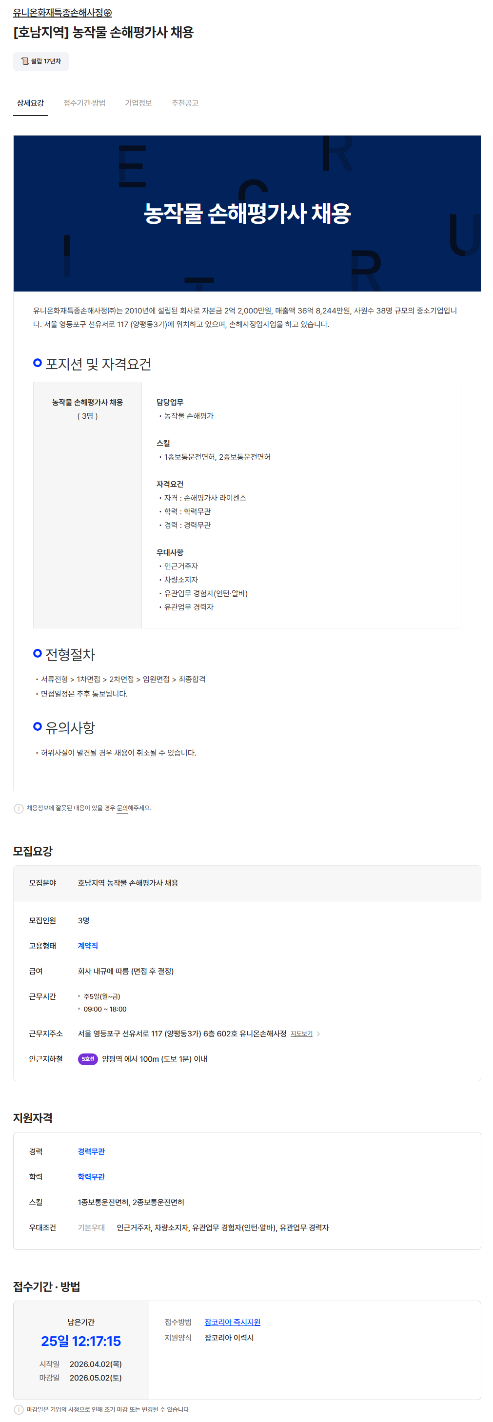 - 잡코리아 채용공고 - 링크주소 : https://www.jobkorea.co.kr/Recruit/GI_Read/48901764?Oem_Code=C1&logpath=1&stext=%EC%86%90%ED%95%B4%ED%8F%89%EA%B0%80%EC%82%AC&listno=5&sc=630