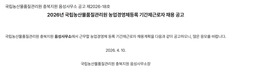 - 국립농산물품질관리원 홈페이지 공고- 링크주소 : https://www.naqs.go.kr/hp/bbs/boardDetail.do?bbsSn=287&pstSn=110132&curPage=1&pageSize=10&searchUseYn=N&menuId=MN30507&menuTypeStvl=BBS&upMenuId=MN20359&hghrkMenuId=MN10001&gnrlzGroupLevelStvl=06010020000000&menuNm=%EC%B1%84%EC%9A%A9%EC%A0%95%EB%B3%B4&upMenuTypeCd=DIR&tmptNm=defaultContents&searchCondition=title&searchKeyword=