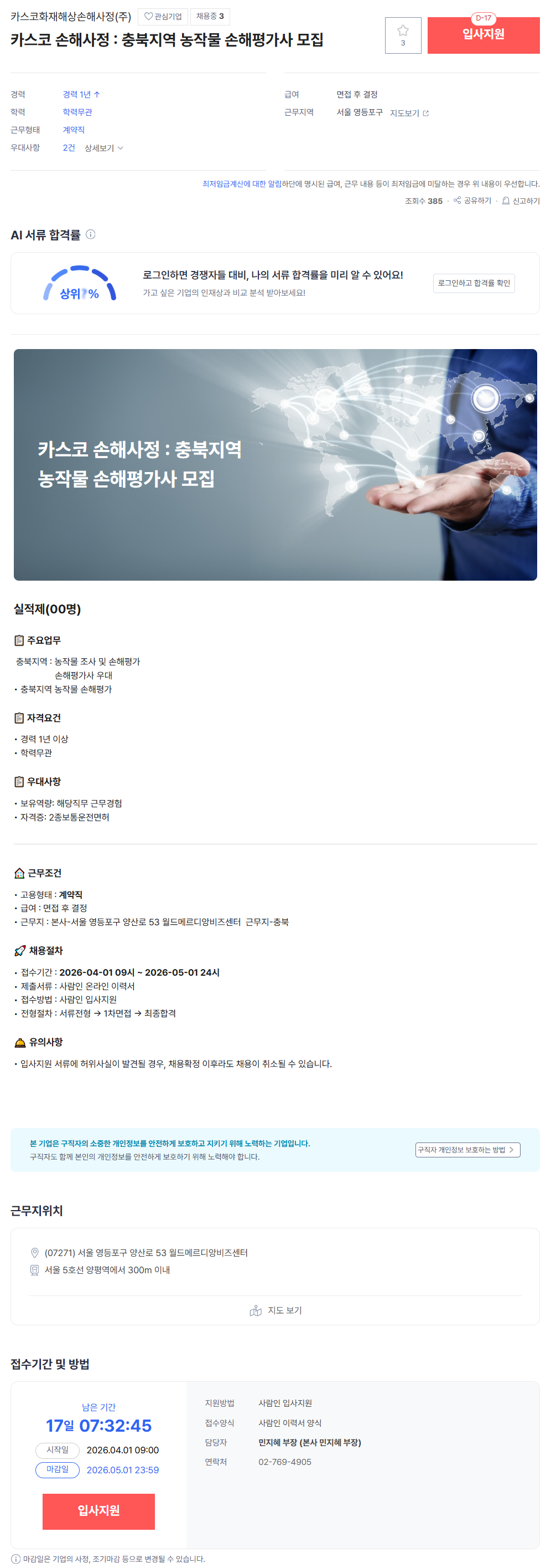 [대양화재특종손해사정(주)] 원주지점 농작물재해보험 조사자 정규직 채용 공고 - 26...