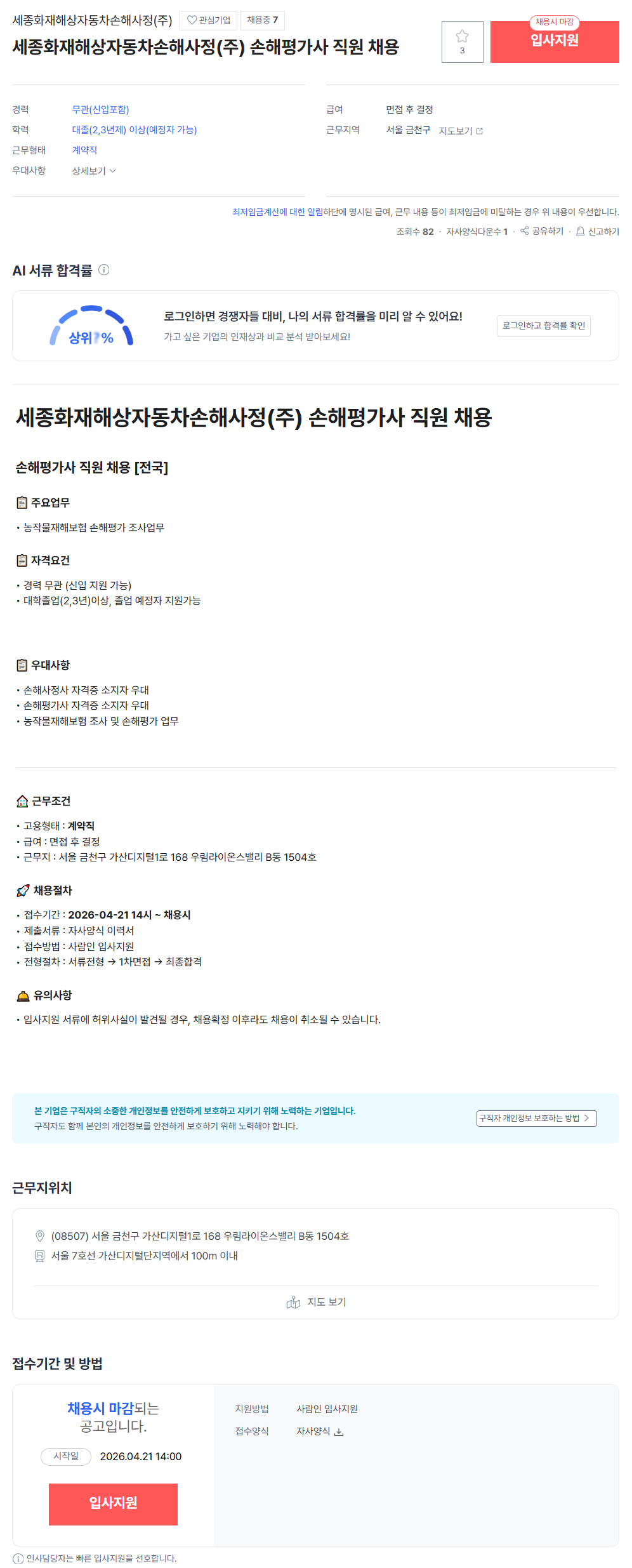 [세종화재해상자동차손해사정(주)] 손해평가사 지원 채용 - 채용시까지 학습관리자 / 2026.04.28