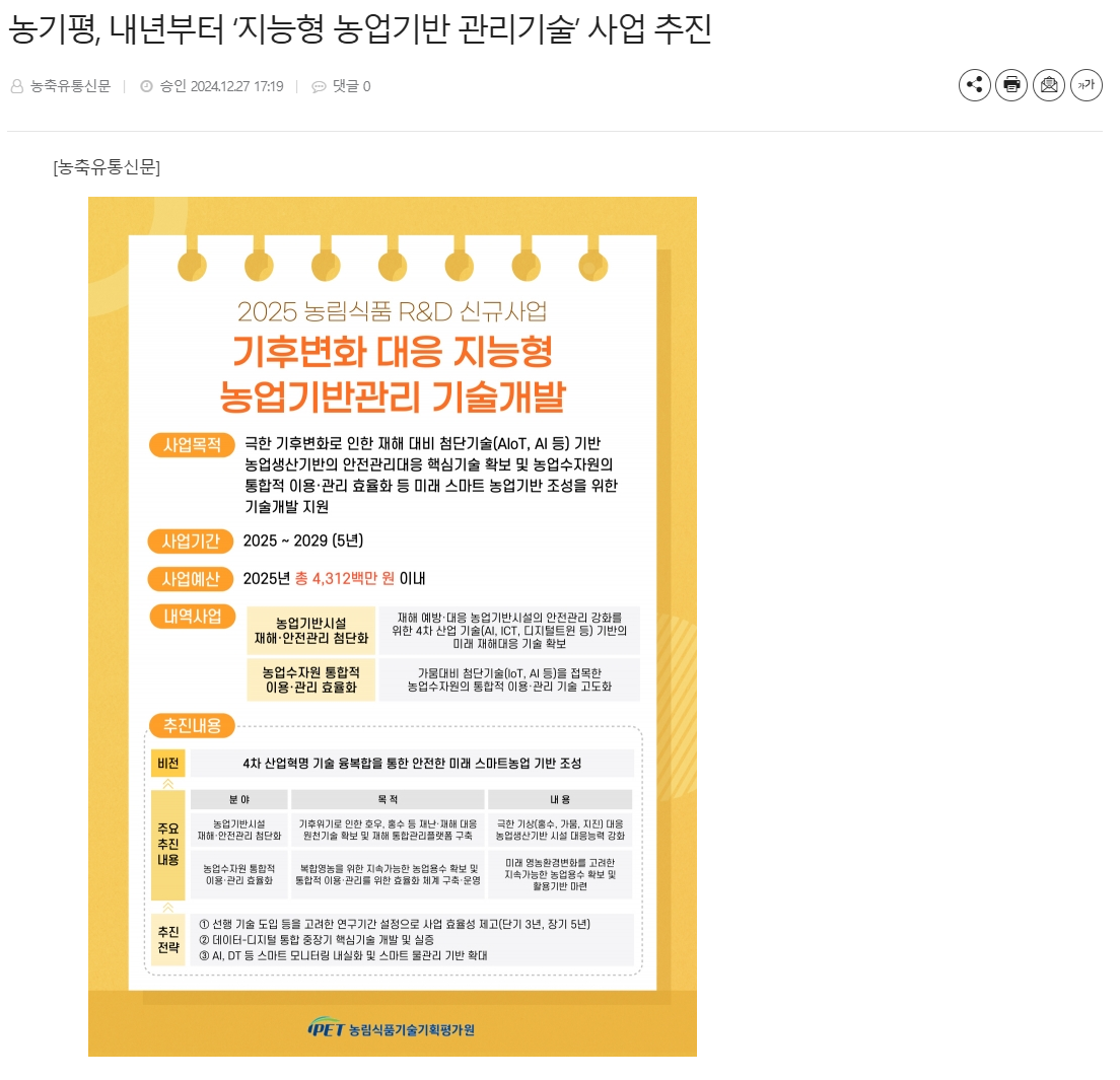 | [농축유통신문] 농기평, 내년부터 ‘지능형 농업기반 관리기술’ 사업 추진 | 학습관리자 / 2025.01.07 | |