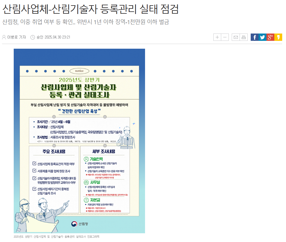 산림청(청장 임상섭)은 오는 6월 말까지 건전한 산림사업체 양성 및 산림기술자 제도 정착을 위해 2025년 상반기 산림사업체 및 산림기술자 실태조사를 실시한다고 28일 밝혔다.