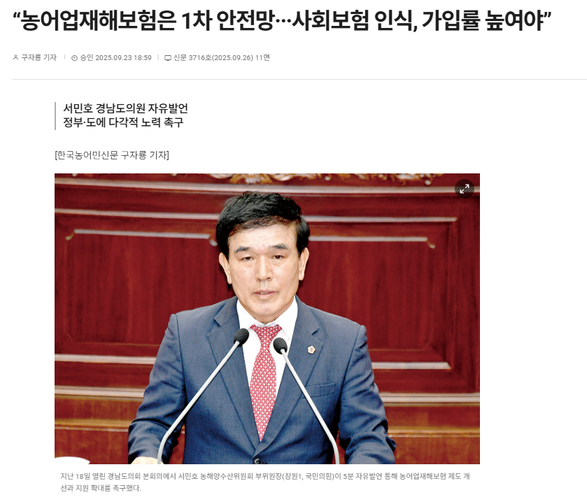 지난 18일 열린 경남도의회 본회의에서 서민호 농해양수산위원회 부위원장(창원1, 국민의힘)은 5분 자유발언 통해 이같이 피력하면서 농어업재해보험 제도 개선과 지원 확대를 촉구했다.