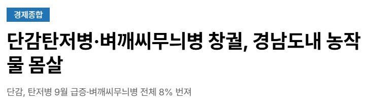 단감 탄저병에 더해 벼깨씨무늬병도 확산 추세를 보이고 있어 농민들의 한숨도 깊어지고 있다. 벼깨씨무늬병은 올해 7~8월 이상 고온과 9월 잦은 강우로 경남에서 4960ha, 경남 벼 면적의 약 8%의 피해가 발생한 것으로 파악된다. 설상가상 최근 가을장마까지 겹쳐 벼 수확이 지연되면서 벼 낟알에서 싹이 트는 수발아 현상(이삭에서 싹이 트는 현상)도 일부 도복된 벼에서 나타나고 있어 농가들의 어려움이 가중되고 있다.