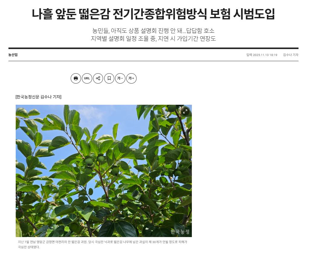 오는 17일 떫은감 농작물재해보험에 전기간종합위험방식 상품이 시범 도입(전남 영암, 경북 상주)되는 가운데, 현재까지(13일 기준) 상품 설명회가 열리지 않아 현장 농민들이 답답함을 호소하고 있다.
