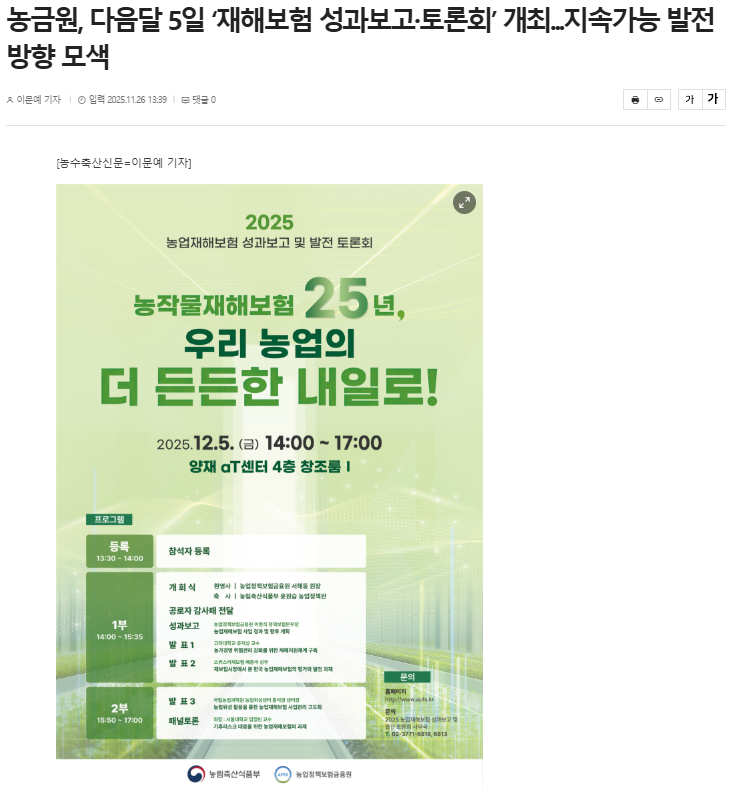 농금원은 다음 달 5일 서울 양재동 소재 aT센터에서 ‘2025년 농업재해보험 성과보고 및 발전 토론회’를 개최한다. 이번 행사는 농작물재해보험 도입 25주년을 맞아 제도의 성과를 돌아보고 급격히 변화하는 기후 환경 속에서 농업재해보험의 지속가능한 발전 방향을 모색하기 위해 마련됐다.