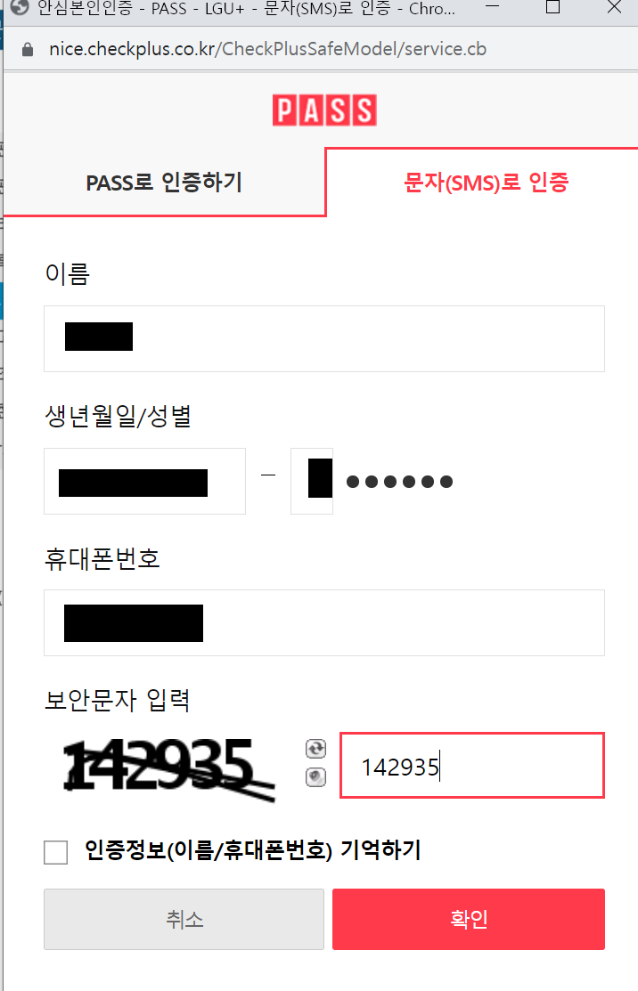 5. 문자로 전송된 인증번호를 입력후 확인 버튼을 누릅니다.